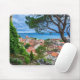 View of the small town Omis surrounded with mountains, Cetina river and sea, Makarska Riviera, Croatia. View of pine tree, old city centre with red rooftops and blue see.