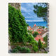 View of the small town Omis surrounded with mountains, Cetina river and sea, Makarska Riviera, Croatia. View of pine tree, old city center with red rooftops and blue see.