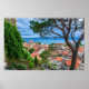 View of the small town Omis surrounded with mountains, Cetina river and sea, Makarska Riviera, Croatia. View of pine tree, old city centre with red rooftops and blue see.