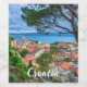 View of the small town Omis surrounded with mountains, Cetina river and sea, Makarska Riviera, Croatia. View of pine tree,  old city center with red rooftops and blue see.