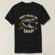 This black t-shirt features a detailed cartoon illustration of a crocodile with its mouth wide open, seemingly about to snap at a mosquito buzzing nearby. The humourous text "DON'T MAKE ME SNAP!" is prominently displayed above and below the crocodile, conveying a playful warning.