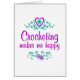 Crocheters will enjoy this beautiful design to express their feelings. Soft flowers and a heart and the words - Crocheting makes me happy.- says it all.