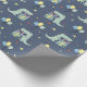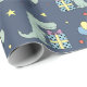 Green crocodile standing on its back legs holding a beautiful wrapped gift and holding a string of yellow and blue balloons. Yellow stars, triangles, and red dots also on a dark blue background.