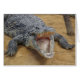 Close-up photograph of a crocodile in the sand with his jaws wide open.