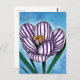 Crocus Will Preen is a simple floral featuring a purple and white striped open crocus bloom over a blue mottled background.