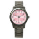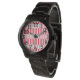 This women's watch has a geometric design of rectangles with diagonal ends in pink and red, repeating throughout the design. If you like the design but prefer different colours, message me.