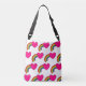 Tote your stuff in style with a cute cross body bag or shoulder tote featuring a repeating pattern of colourful rainbows emerging from bright pink hearts on one side and a single heart with rainbow on the other side. Original artwork by Buttercup's Clothing and Collectables.