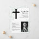 Greenery memorial announcement, featuring a photo of your loved one and a tasteful typography in black on white with pale green line art of greenery and a cross.