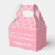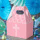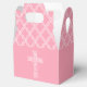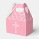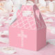 A white open weave cross on a pink background - CHANGE TO ANY COLOR - and a quatrefoil design on the top, these favour boxes are ideal for your child's Christening, Baptism, Dedication or First Communion celebration. Personalise with your child's name and other details on the back. Available in several shades of pink and lots of other colours or use our colour picker tool to change to your perfect colour. MATCHING items in our store.
