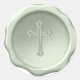 Inside a sage green wax seal with irregular contour, with an embossed cross (It is not really embossed, the illusion of embossed is simulated in the artwork).