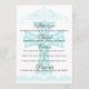 Cross themed wedding menu cards feature a cross design with calligraphy borders and multiple text fields that you can customise with your personal details on the front while the back has a damask pattern in blue and brown.