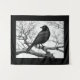 Tapestry in a black-and-white illustration featuring a sleek black crow perched on a gnarled, leafless branch. The bird's detailed feathers contrast sharply with the stark, skeletal tree limbs, creating a dramatic composition.
