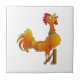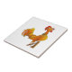 This cartoon style rooster has brown / yellow feathers. He is perched on a wooden fence rail. this head is back as he crows. The has a long tail feathers and a red crop, and also red around his eyes. This bantam is a cute we fella.