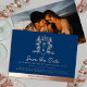 Crown heart crest with foliage and berries outline art wedding photo save the date card in deep rich blue and rose gold foil or your own choice. Edit this save the date card with your own names and wedding date on one side and add your own photo on the reverse. Other matching items and colour options are available. Original hand drawing and design by Sarah Trett for www.mylittleedenweddings.com