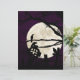 A dark purple sky with full, bright moon and silhouettes of branches, grave stones and crows.