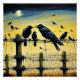 A.I .created print of a group of crows perch on barbed wire fencing, set against a radiant sunset resulting in a psychedelic sky above a polychromatic landscape.