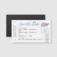 Miniature boarding pass cruise ship ticket save the date magnet to include with your destination wedding save the date suite features a grey silver cruise ship with waves illustration and elegant retro modern fonts with space to add a custom cabin number by the barcode. These mini ticket magnets are the same size as a business card and do not come with envelopes unless you opt to add them. They are a perfect design to compliment any other save the date cards you are sending for your travel theme cruise destination wedding and guests will love them!