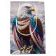 Bald eagle draped in an American flag with a tear in its eye perched on a mountain peak.