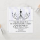 A sophisticated housewarming party invitation featuring an illustration of a crystal chandelier. Background is blue and white vertical stripes. Opposite side features matching blue and white striped background. Sheer section features black trim. Personalise the black text with details of your event. Look for matching items such as postage, stationery, and stickers at Jill's Paperie.