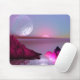 A colourful 3d render of an ocean at sunset with a planet that appears luminous, could be crystal and colourful ocean rock formations on a sea of lavender.