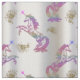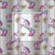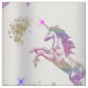 A pretty and colourful pattern of crystal unicorns (each unicorn is made from tiny rainbow-coloured crystals - printed only) with blue and pink sparkles on the end of their horns. They're all prancing over a luxe silver background, with little piles of golden glitter scattered all around them.