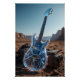 Hyper-realistic digital artwork of a sleek biomechanical glass crystal guitar, featuring intricate circuit-like patterns embedded within its transparent body. The design suggests a protective energy field, with glowing neon accents tracing its facets. The guitar leans dynamically against weathered tactical equipment on a sunlit battlefield, with distant cliffs adding dramatic contrast. Precision technical lines, smooth airbrush transitions, and sharp neon highlights emphasize its futuristic functionality and professional-grade, high-detail craftsmanship.