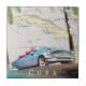 Illustrated map of Cuba (plus surrounding islands) in a beautiful vintage detailed style with a classic old cuban car in the sunset.