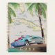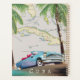 Illustrated map of Cuba (plus surrounding islands) in a beautiful vintage detailed style with a classic old cuban car in the sunset.