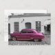 A vintage American car is parked on the old streets of Trinidad in Cuba. The background is turned into black and white so the stunning purple colour of the car stands out more.