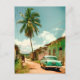 Lovely retro photograph from a sandy street in the country side of Cuba. Summer day with large palm tree, Cuban woman and an American oldtimer car.