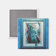 An artwork features a semi abstract woman with a shawl / veil in blue, white, and pink tones.