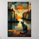This painting depicts a black cat standing on a dock, gazing out at a tranquil river during sunset. The artwork is characterized by cubist elements and optical illusions, with a nod to the Venetian school of painting. The color palette features shades of aquamarine and amber, adding to the overall serene mood of the piece. Additionally, the painting captures the essence of romantic riverscapes, with colorful street scenes in the background.