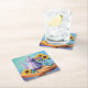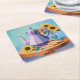 This coaster features a digital painting in a Cubist art style depicting a charming lavender teapot on a round wooden table. The teapot has geometric angles and a stylised handle, accented with a few scattered teal cubes. Around the teapot are a few shortbread cookies and a small glass vase filled with yellow sunflowers with a few teal cubes. The background is a soft, gradient blue that emphasizes the teapot's delicate colour. The coaster is a square paper pulp coaster. The coaster set contains six coasters.