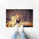 This doormat has a picture of two lions cuddling on it.