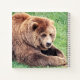Big, cuddly and content brown bear lying in the grass looking at the camera.