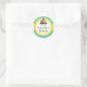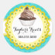 © 2014 Socialite Designs. Elegant cupcake bakery sticker design incorporating a turquoise damask pattern background, yellow scalloped border banner for your text, and a mocha cupcake inside a circle.