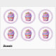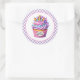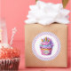 Round sticker is shown with a cute cupcake birthday unicorn print.