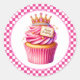 Round sticker is shown with a cute cupcake birthday princess crown print.