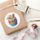 Round sticker is shown with a cute birthday cupcake topped with a books print.