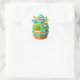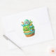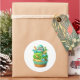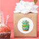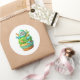 Round sticker is shown with a cute cupcake birthday dinos print.