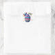 Round sticker is shown with a cute cupcake birthday space rocket print.
