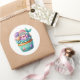 Round sticker is shown with a cute cupcake birthday mermaid print.