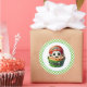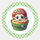 Round sticker is shown with a cute cupcake birthday sports soccer/basketball print.