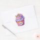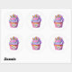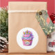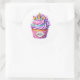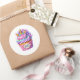 Round sticker is shown with a cute cupcake birthday unicorn print.