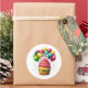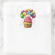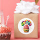 Round sticker is shown with a cute cupcake birthday balloons print.