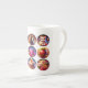 This beautifully designed mug features a collection of nine round, vibrant illustrations that add a touch of whimsy and charm. Each image showcases colorful, playful scenes including a black cat, a lucky Maneki Neko, strawberries, sweets, and magical motifs. The intricate details and rich, warm color palette make this mug stand out, offering a delightful visual journey with every sip.