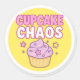 A sweet round sticker featuring a pastel cupcake with swirled frosting, candy stars, and sprinkles. Bold bubble text reads “Cupcake Chaos.” Perfect for laptops, water bottles, and notebooks — a playful reminder to embrace the mess with flavor.