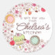 Cute doodle style cupcake, cookie, and flowers on this "from the kitchen of" or "homemade by" sticker for a baker, home baking biz, bakery, or pastry chef, personalised with your text and colour scheme, perfect for gifting or selling baked goods.