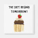 A square white fridge magnet with a delicious chocolate cupcake, topped with cream and a strawberry, made from a handpainted paper collage design by Judy Adamson. Above the cupcake are the words, 'The Diet Begins Tomorrow!'. A fridge magnet to test the resolve of any dieter! The chocolate cupcake is also available on a Greeting Card and on a ladies' spaghetti strap T-shirt.