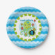 Cupcake Octopus 6th birthday party paper plates features a green and blue smiling octopus holding birthday cupcakes and balloons, text that reads Look Who's 6, and a wide background border of blue ocean waves! These cute octopus 6th birthday paper plates are perfect for the birthday party whether a big celebration or a small get together!